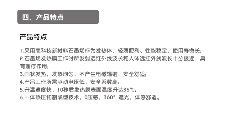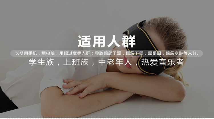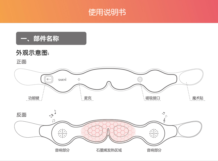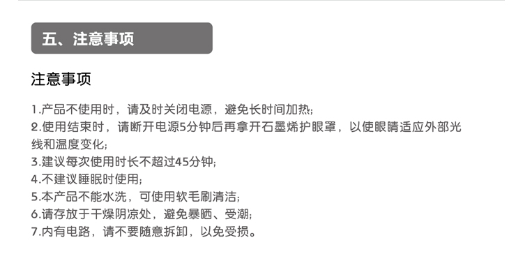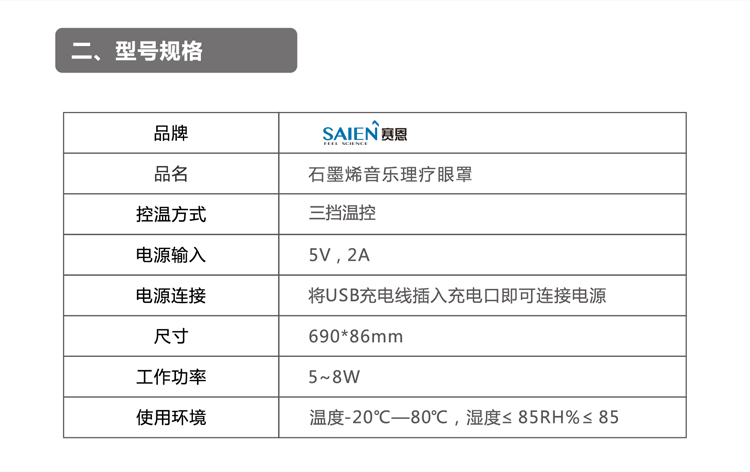 [品牌]:SAIEN賽恩 [産品名稱]:石墨烯音(yīn)樂(yuè)理(lǐ)療眼罩 [控溫方式]:三檔控溫 [電(diàn)源輸入]:5v 2A [電(diàn)源連接]:将USB充電(diàn)線插入充電(diàn'÷λ)口即可(kě)連接電(diàn)源 [尺寸]:680*86mm [工(gōng)作(zuò)功率]:5~8W [使用(yòng)環境]:溫度-20°C—80°C,濕度≤85RH%≤85